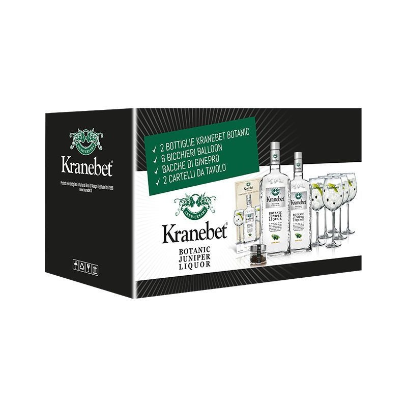 GIN KRANEBET CL.70 CONFEZ.SPECIALE 6 BICC+2 ESP+BACCHE GINROSSI D ASIAGO : Il gin Kranebet è disponibile nel formato da 70 cl con una confezione speciale che include 6 bicchieri, 2 espositori e bacche Ginrossi d Asiago